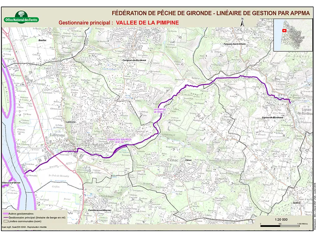 Cette petite rivière prend sa source à Créon, possède 2 affluents sur la commune Le Gouchebouc et Le Ruzat et se jette après 16,9 km dans la Garonne.