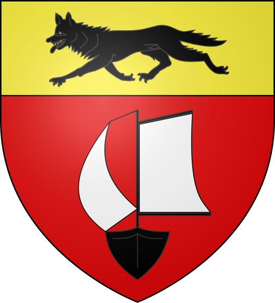 Le Blason : « De gueules à la barque de sable de front, habillée d’argent, grand-voile à senestre et foc à dextre, au chef d’or chargé d’un loup passant de sable«
