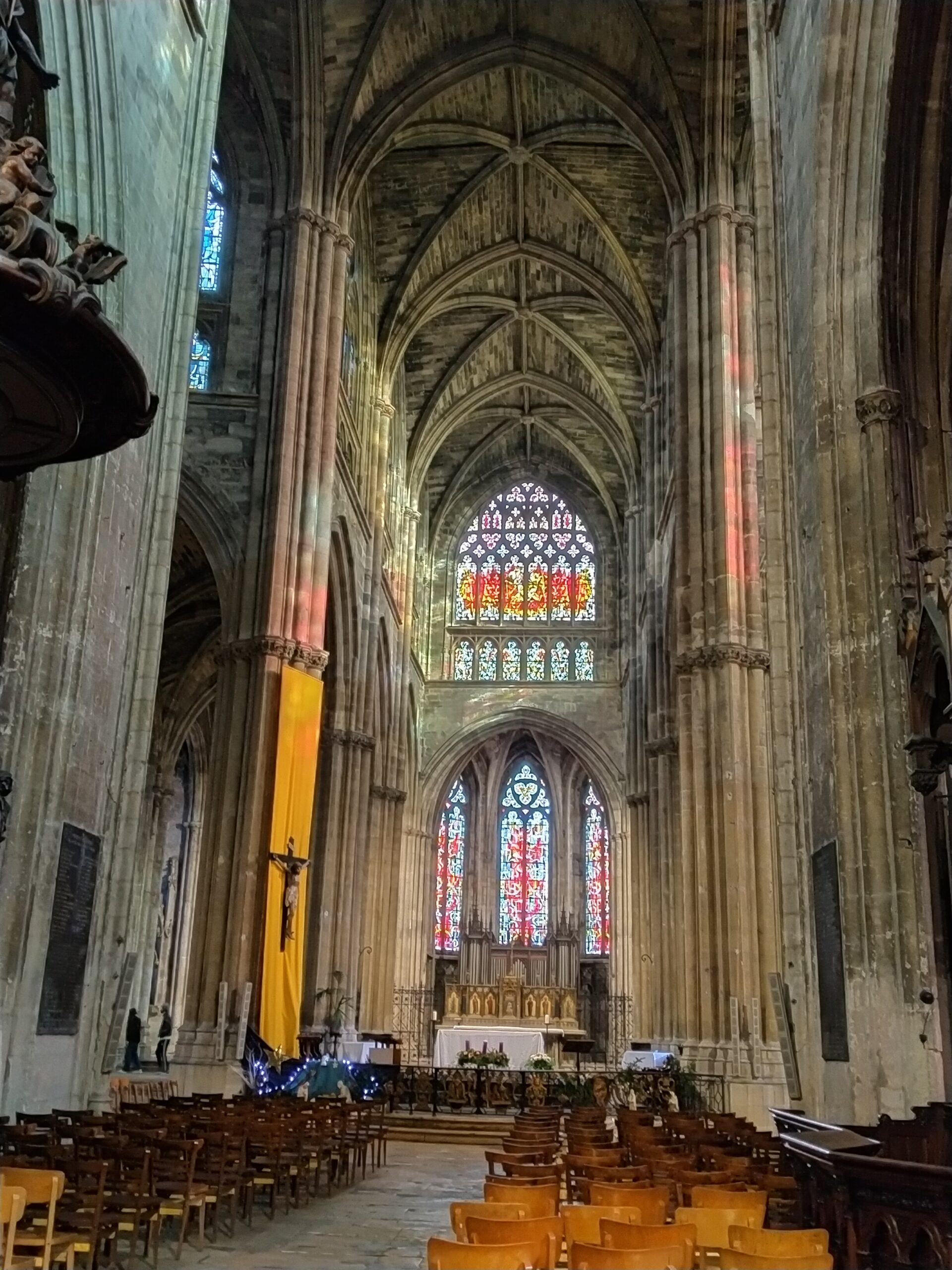 De style gothique flamboyant, église puis basilique, elle fut bâtie entre les 14e et 16e siècles. Avec ses 75m de long, 38m de large, 23m de haut, elle est l’un des plus grands lieux de culte de la ville et une étape importante pour les pèlerins. Tout comme la cathédrale Saint-André, la basilique a la particularité d’être dotée d’un clocher indépendant : la flèche Saint Michel.